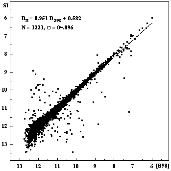 Comparison of the B magnitude between B-1958 catalogue and SIMBAD.