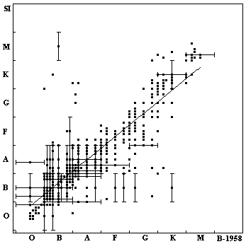 Comparison of the spectral classes between B-1958 catalogue and SIMBAD.