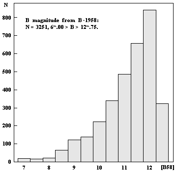 The distribution of the B magnitude of objects in the B-1958 catalogue.