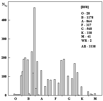 The distribution of the spectral classes of objects in the B-1958 catalogue.