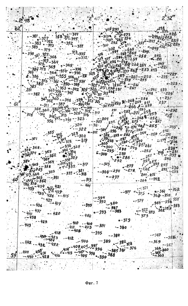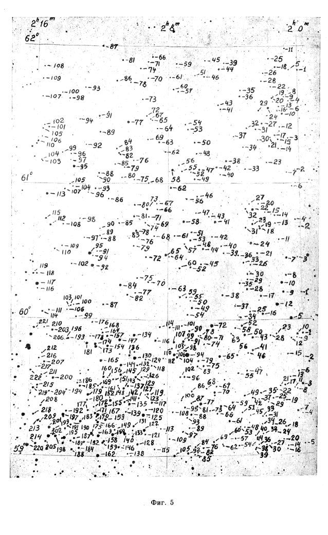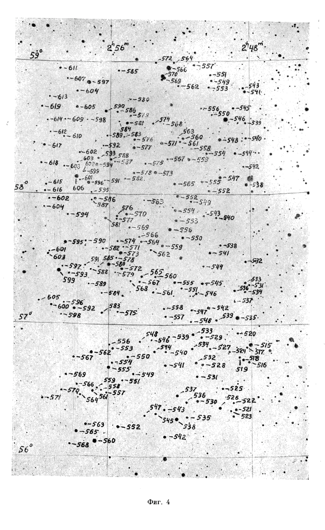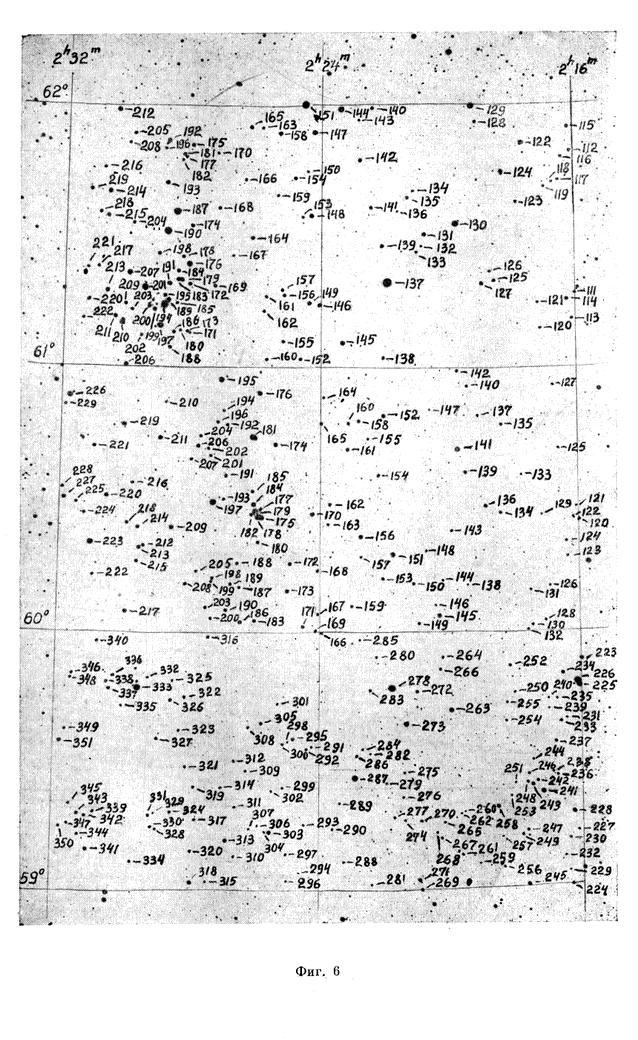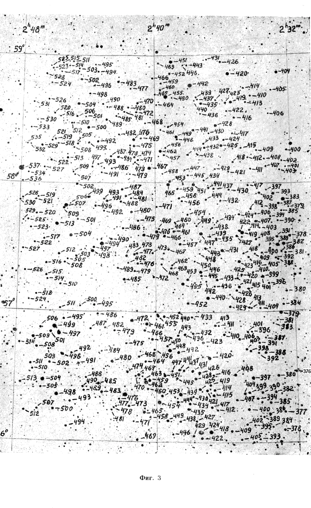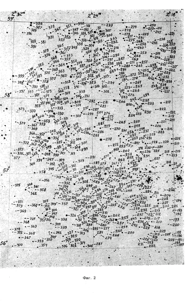 The spectral types and photographic magnitudes of 3340 stars brighter than 12m,5 were determined in an area of about 45 square degrees with the center a1950 = 02h30m, d1950 = +58o00'. For О, B, A and F stars the colour indices were also found. The photographic magnitudes and color indices were reduced to the (В, V) system. |